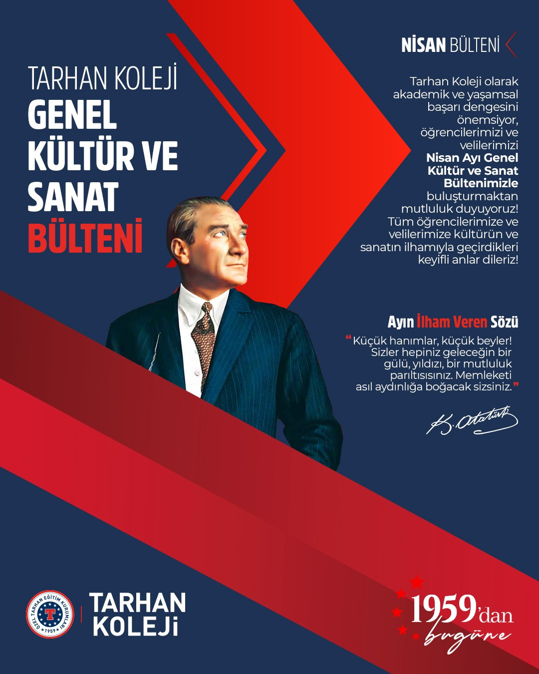 Tarhan Koleji olarak, öğrenci ve velilerimizi her ay ”Kültür ve Sanat” bültenimizle buluşturmaktan heyecan ve mutluluk duyuyoruz! Bu ay ve her ay kültür ve sanat dolu bültenimizi bu platformdan da yayınlayacak, güzellikleri paylaşarak ilham yolculuğumuzu devam ettireceğiz… Nisan ayı ”Kültür ve Sanat” bültenimiz şimdi sizlerle…
